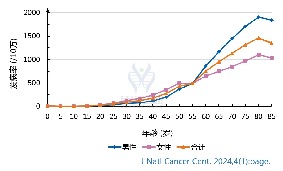 • 全癌种的发病率在0-34岁年龄组相对较低,从35-39岁年龄组开始显著增加,在80-84岁年龄组达到峰值。